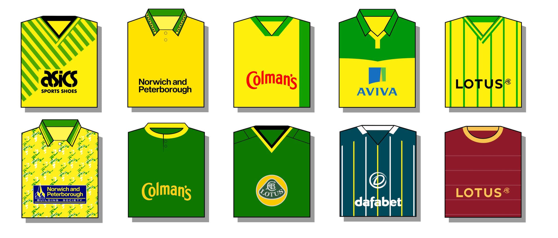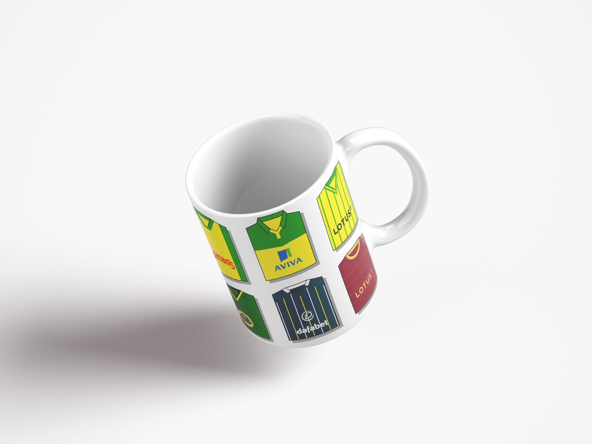 Drinking mug featuring 10 classic Norwich shirts