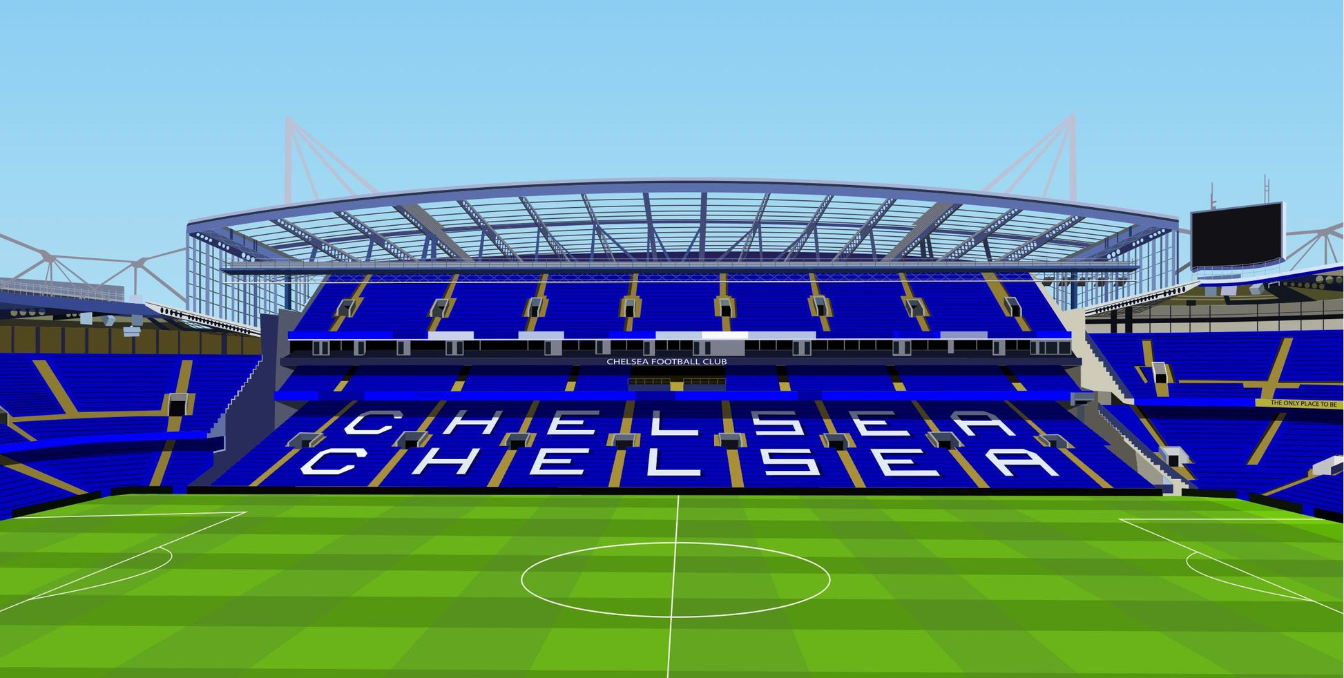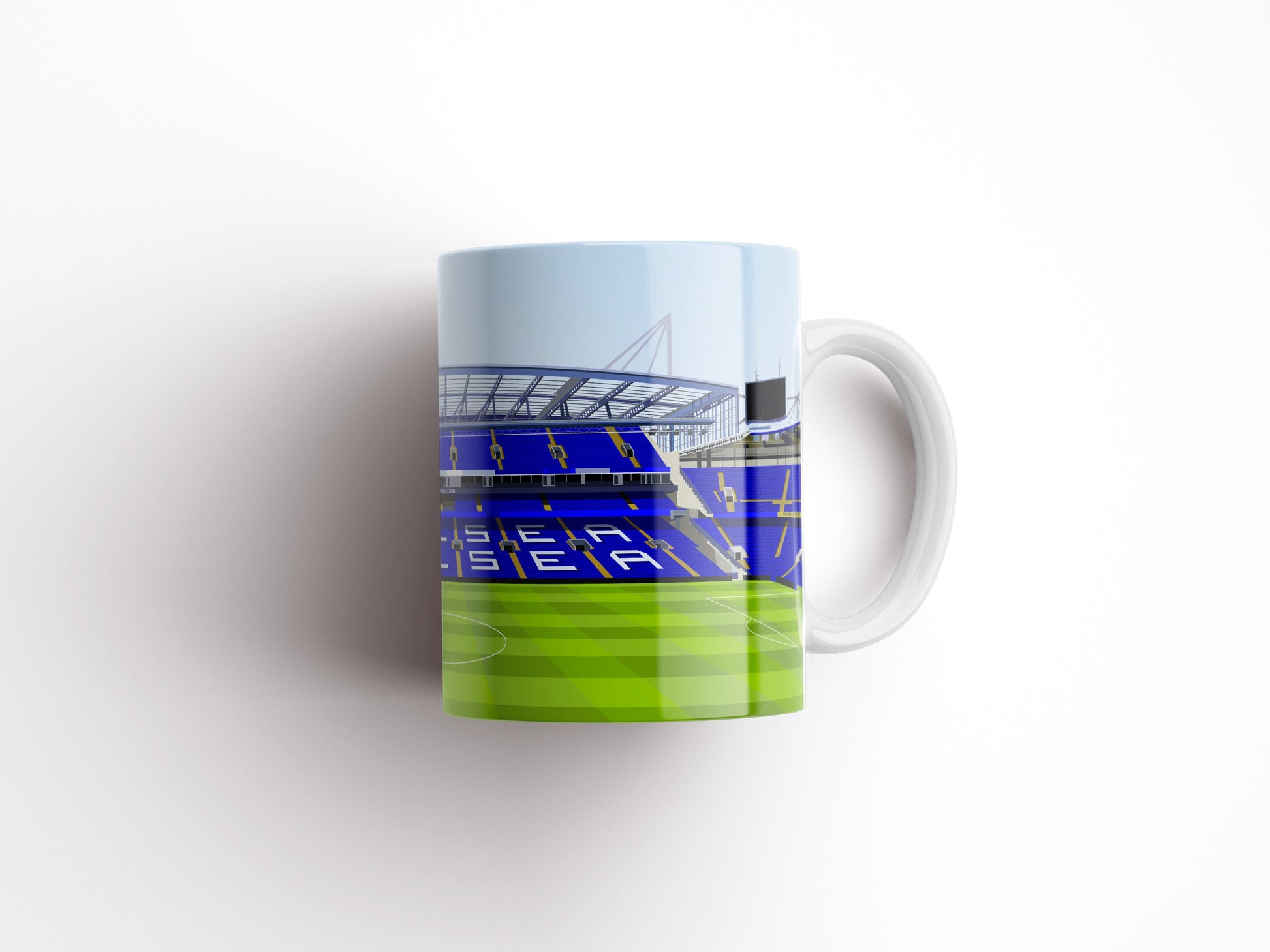 High quality 11oz ceramic mug with glossy white finish featuring Chelsea's Stamford Bridge stadium.